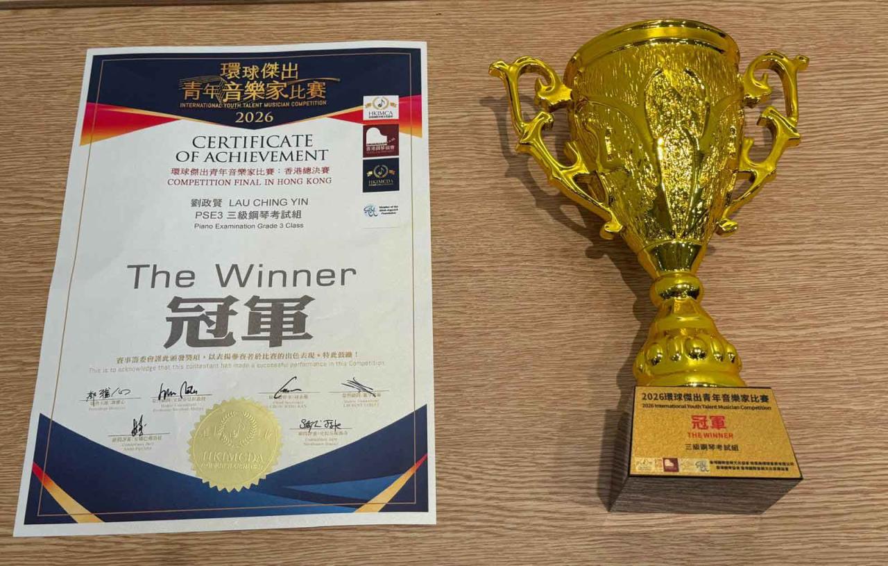 校園再傳樂聲喜訊!我校 4D 班劉政賢同學 在由香港國際音樂文化發展協會主辦的 「2026 環球傑出青年音樂家比賽」 中,憑藉精湛的演奏技巧與深刻的音樂詮釋,勇奪 香港總決賽冠軍!