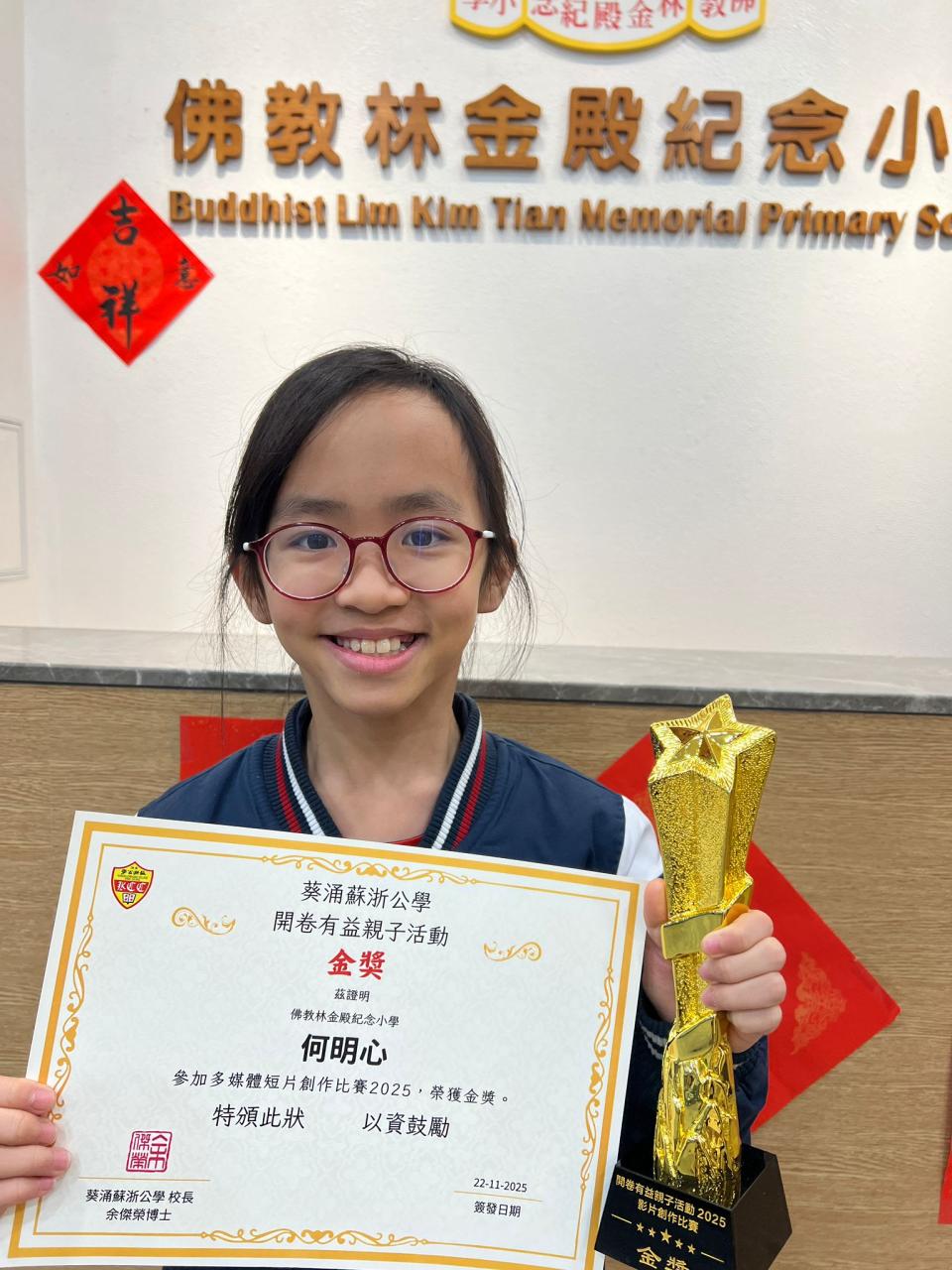 好消息傳來! 本校 5E 班 何明心 同學及其家人,在 葵涌蘇浙公學 主辦的「開卷有益」親子活動——多媒體短片創作比賽中,憑藉出色的創意與細膩的情感,成功奪得 金獎!