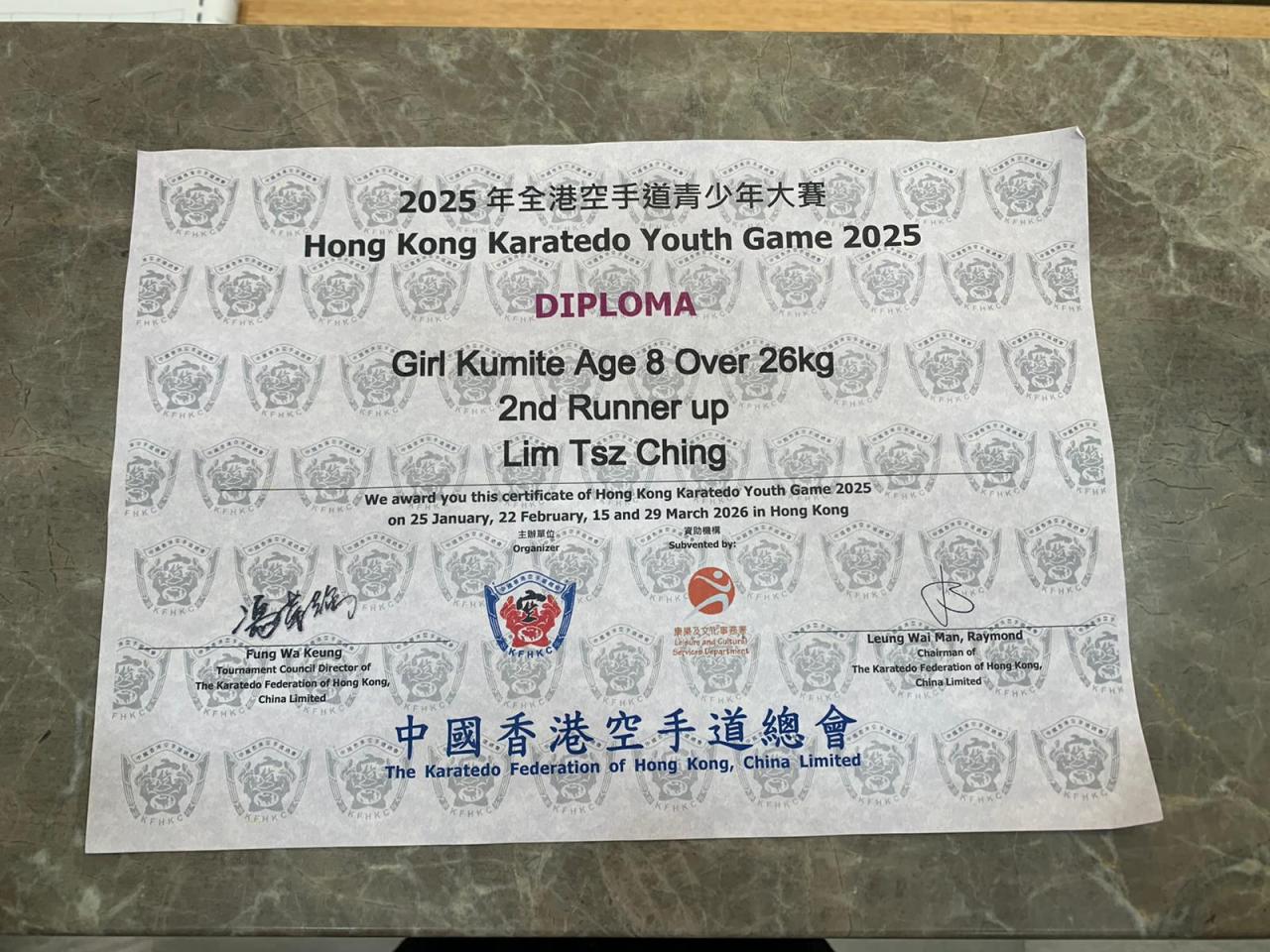 本校 3C 班 林梓晴 同學早前參加了由中國香港空手道總會主辦的 《2025年全港空手道青少年大賽》。經過多輪激烈的較量,梓晴憑著出色的技術與堅毅不屈的精神,在「女童8歲 26公斤以上」組別中脫穎而出,勇奪 季軍 殊榮!